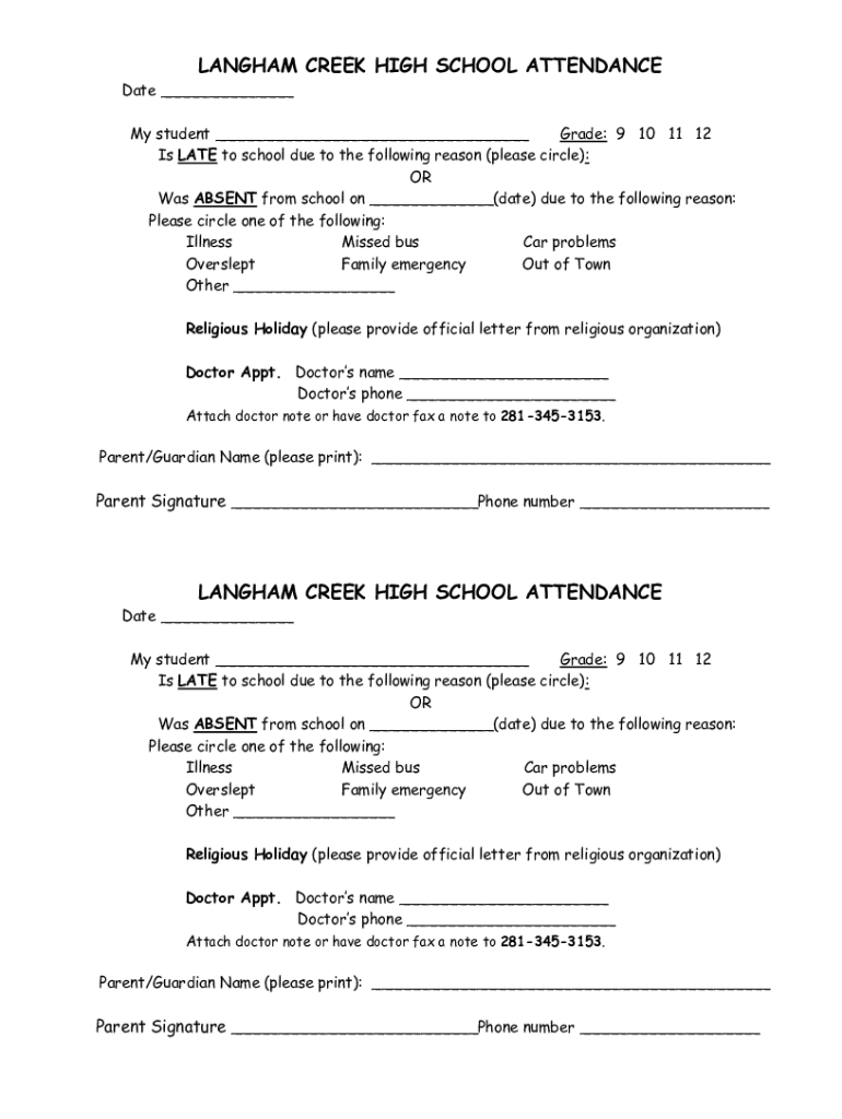 LANGHAM CREEK HIGH SCHOOL ATTENDANCEDate ___My student ___ Grade: 9 10 11 12 Is LATE to school due to the following reason (please circle): OR Was ABSENT from school on ___(date) due to the following