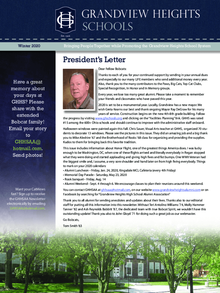 A LU M N I A S S O C I AT I O N N E WS L E T ER Winter 2020Bringing People Together while Promoting the Grandview Heights School SystemPresidents Letter Dear Fellow Bobcats:Have a great memory about