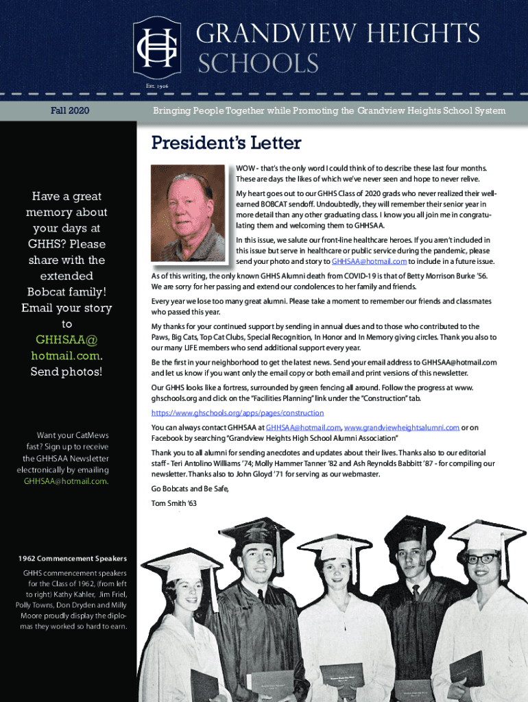 A LU M N I A S S O C I AT I O N N E WS L E T ER Fall 2020Bringing People Together while Promoting the Grandview Heights School SystemPresidents Letter WOW that's the only word I could think of to