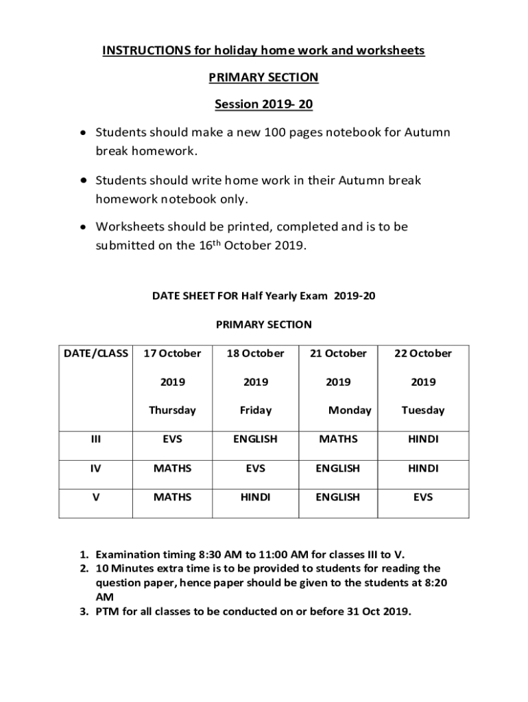 INSTRUCTIONS for holiday homework and worksheets PRIMARY SECTION Session 2019 20 Students should make a new 100 pages notebook for Autumn break homework. Students should write homework in their Autumn