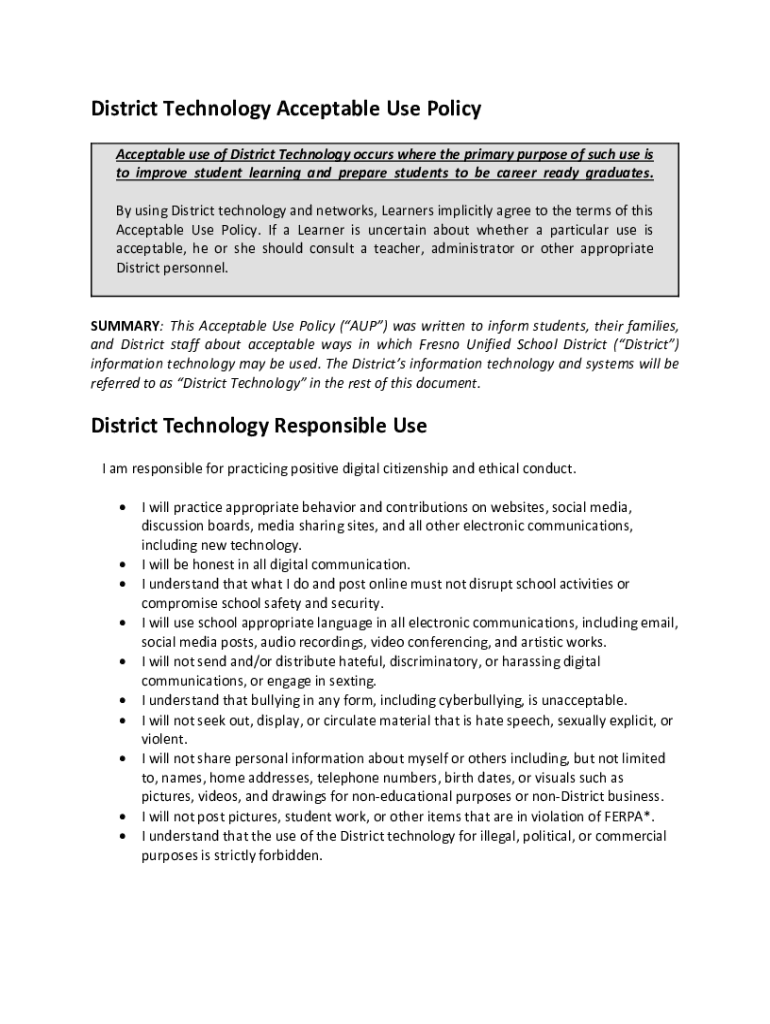 District Technology Acceptable Use Policy Acceptable use of District Technology occurs where the primary purpose of such use is to improve student learning and prepare students to be career ready