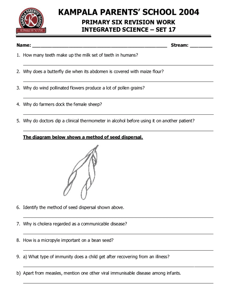 KAMPALA PARENTS SCHOOL 2004 PRIMARY SIX REVISION WORK INTEGRATED SCIENCE SET 17 Name: ___ Stream: ___ 1. How many teeth make up the milk set of teeth in humans? ___ 2. Why does a butterfly die when