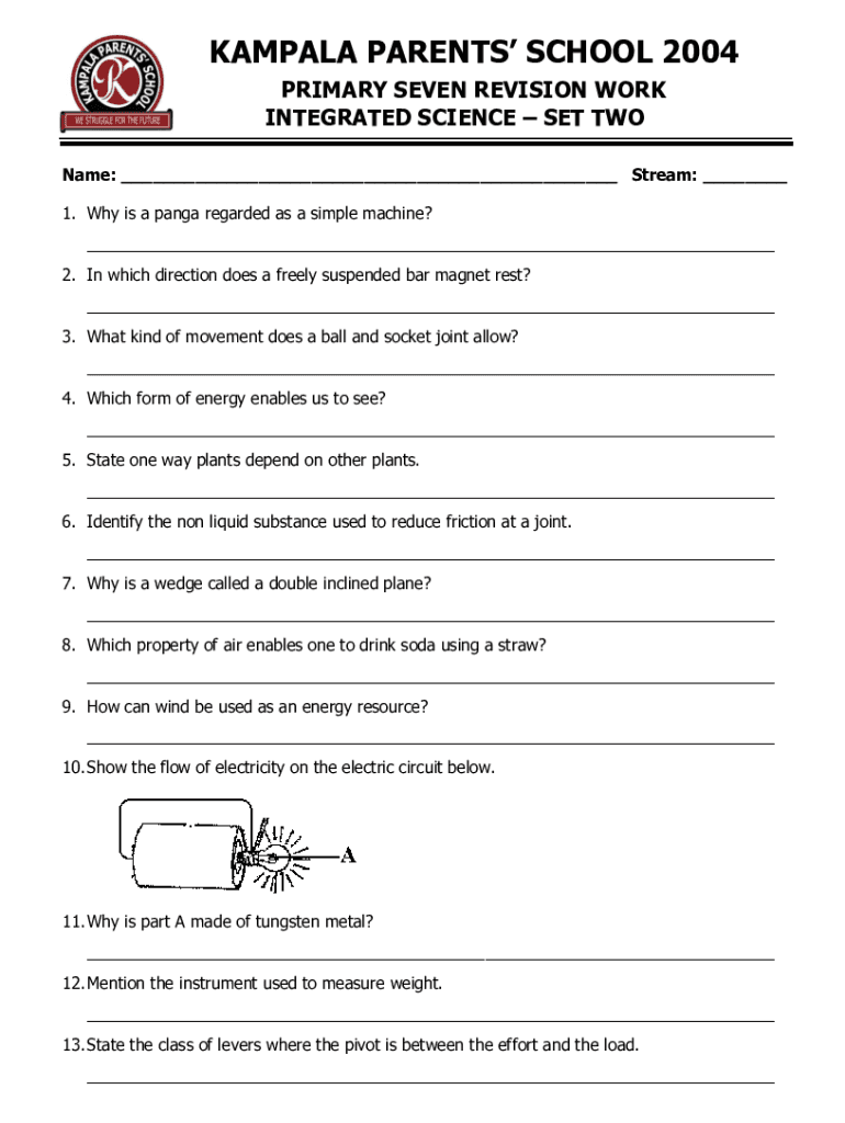 KAMPALA PARENTS SCHOOL 2004 PRIMARY SEVEN REVISION WORK INTEGRATED SCIENCE SET TWO Name: ___ Stream: ___ 1. Why is a panda regarded as a simple machine? ___ 2. In which direction does a freely suspended