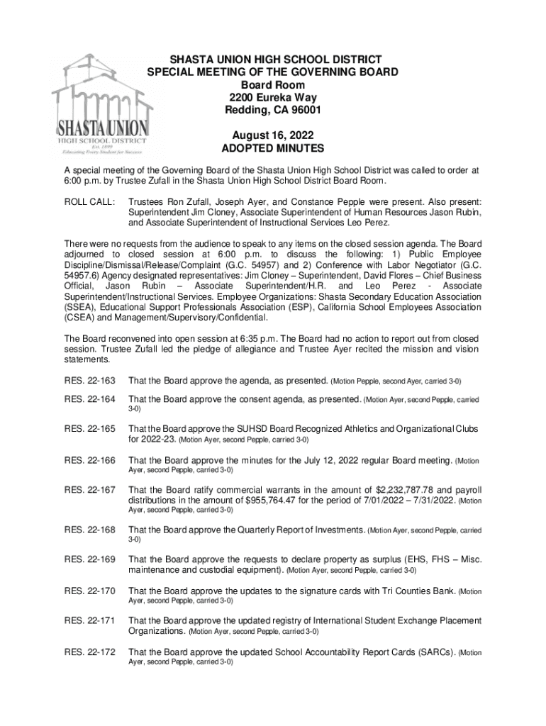 SHASTA UNION HIGH SCHOOL DISTRICT SPECIAL MEETING OF THE GOVERNING BOARD Room 2200 Eureka Way Redding, CA 96001 August 16, 2022, ADOPTED MINUTES A special meeting of the Governing Board of the Shasta