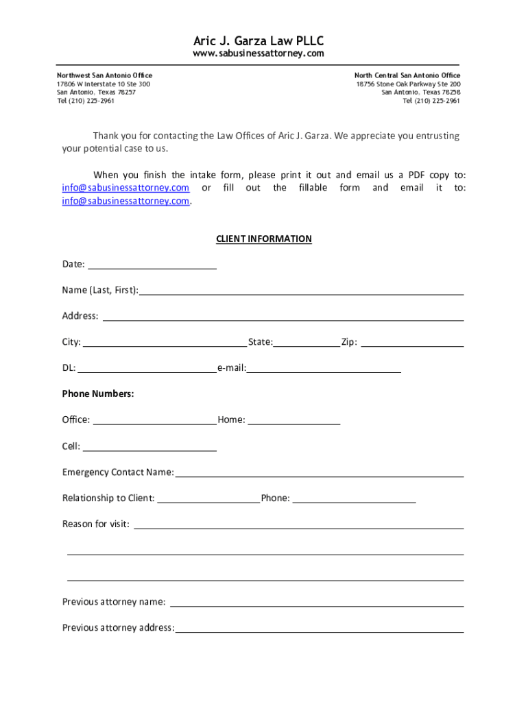 ARIC J. Garza Law PLLCwww.sabusinessattorney.com Northwest San Antonio Office 17806 W Interstate 10 Ste 300 San Antonio, Texas 78257 Tel (210) 2252961North Central San Antonio Office 18756 Stone Oak