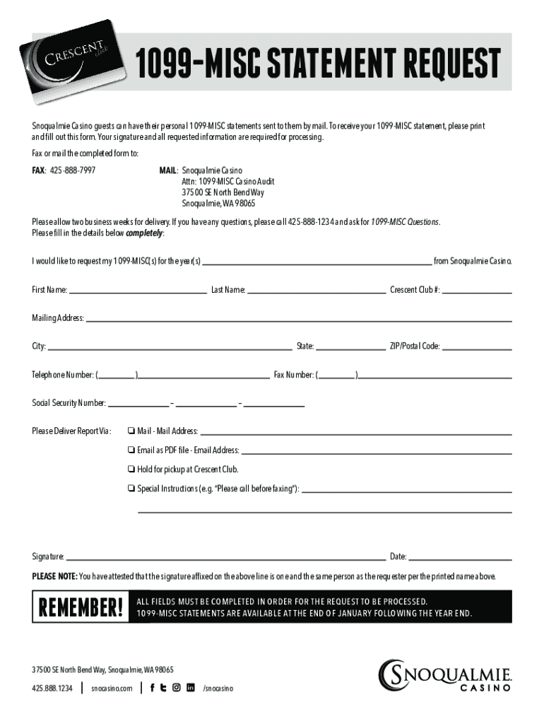 1099MISC STATEMENT REQUEST Snoqualmie Casino guests can have their personal 1099MISC statements sent to them by mail. To receive your 1099MISC statement, please print and fill out this form. Your