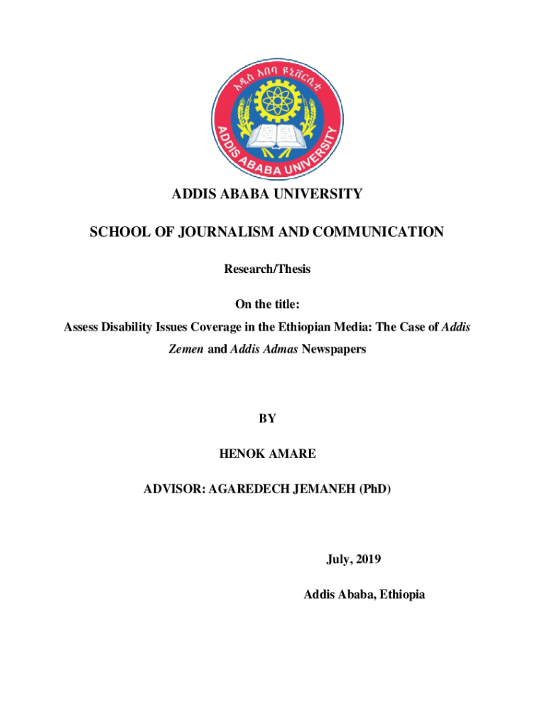 ADDIS ABABA UNIVERSITY SCHOOL OF JOURNALISM AND COMMUNICATION Research/Thesis On the title: Assess Disability Issues Coverage in the Ethiopian Media: The Case of Adds Yemen and Adds Adams Newspapers