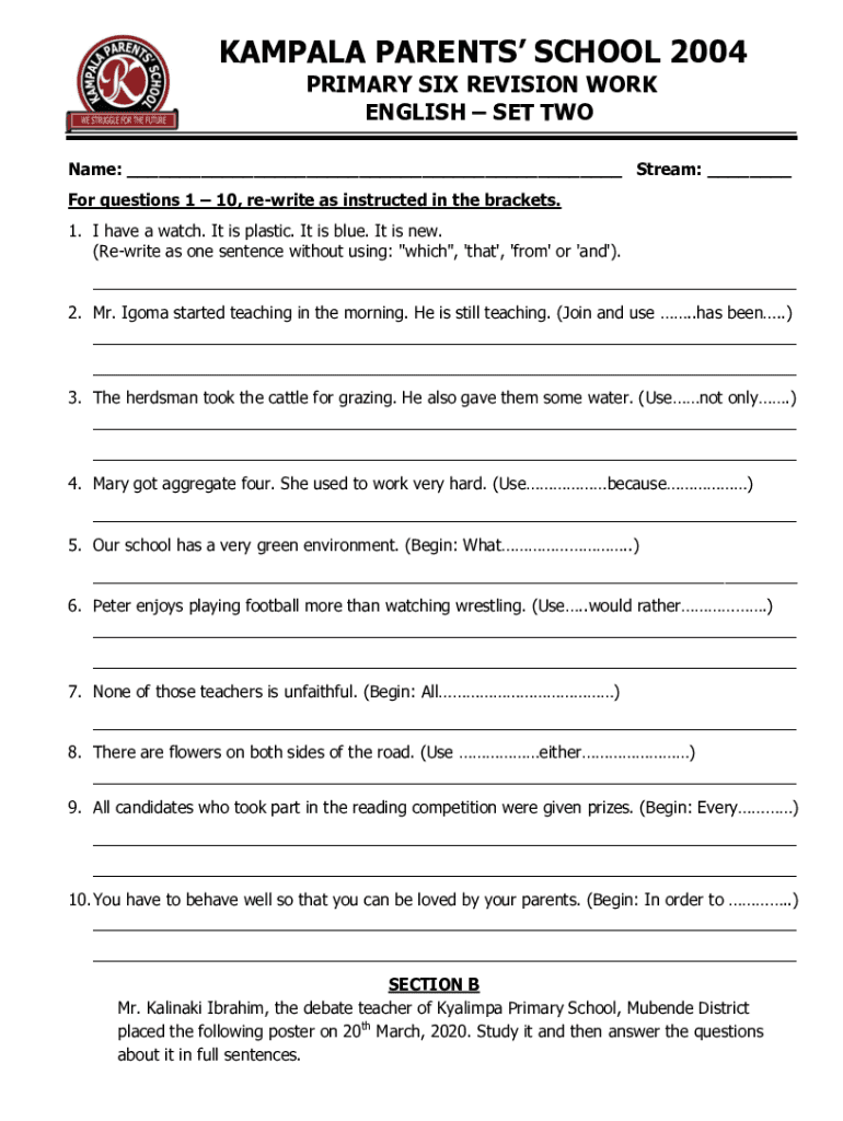 KAMPALA PARENTS SCHOOL 2004 PRIMARY SIX REVISION WORK ENGLISH SET TWO Name: ___ Stream: ___ For questions 1 10, rewrite as instructed in the brackets. 1. I have a watch. It is plastic. It is blue.