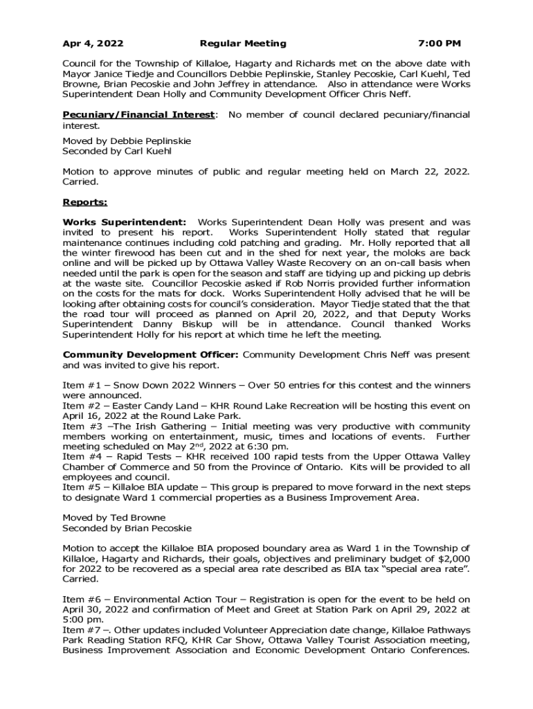 Apr 4, 2022Regular Meeting7:00 Council for the Township of Kill aloe, Hag arty and Richards met on the above date with
