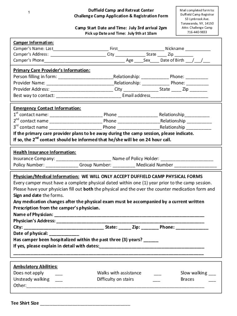 1Duffield Camp and Retreat Center Challenge Camp Application & Registration Form Camp Start Date and Time: July 3rd arrival 2pm Pick up Date and Time: July 9th at 10amMail completed form to: Duffield