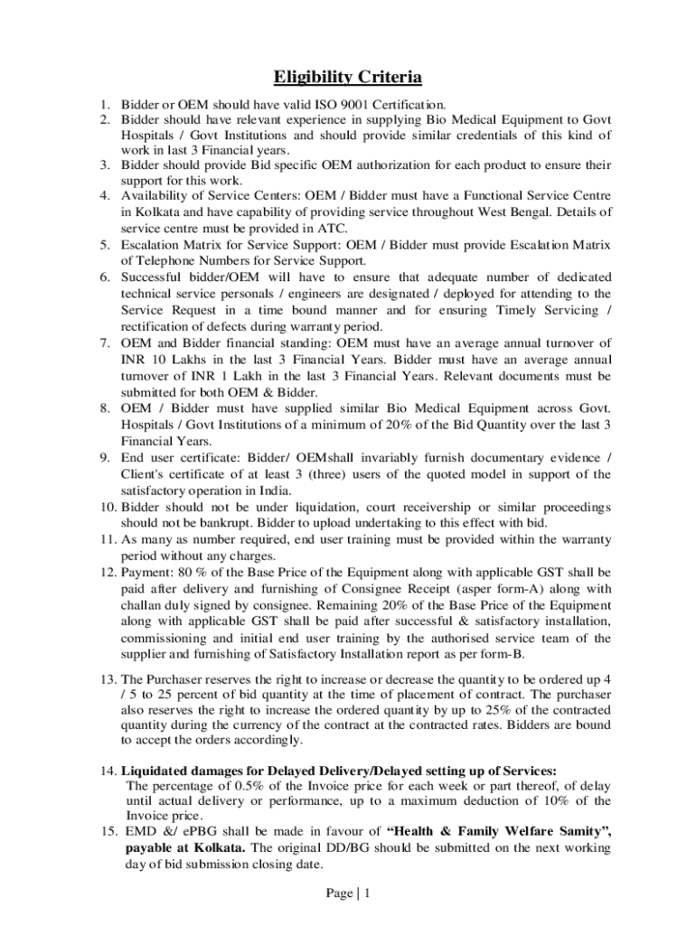 Eligibility Criteria 1. Bidder or OEM should have valid ISO 9001 Certification. 2. Bidder should have relevant experience in supplying Bio Medical Equipment to Govt Hospitals / Govt Institutions and