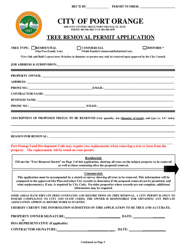 RECD BY___PERMIT NUMBER: ___CITY OF PORT ORANGE 1000 CITY CENTER CIRCLE PORT ORANGE, FL 32129 PHONE 3865065602 FAX 3865065699TREE REMOVAL PERMIT APPLICATION TREE TYPE:RESIDENTIALCOMMERCIAL(One/Family