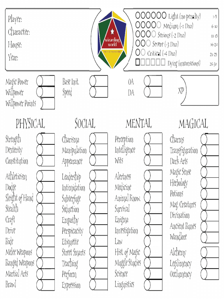 000000 Light (no penalty) 00000 Mt\'quid (1 Did) 0000 Serious (2 Did) 000 Stat\'rt\' (3 Did) 00 Critical (4 Did)Player: Character: House:Year:Magic Power (RJ Willpower (RJ Willpower Point) 1PHYSICALStrrnith