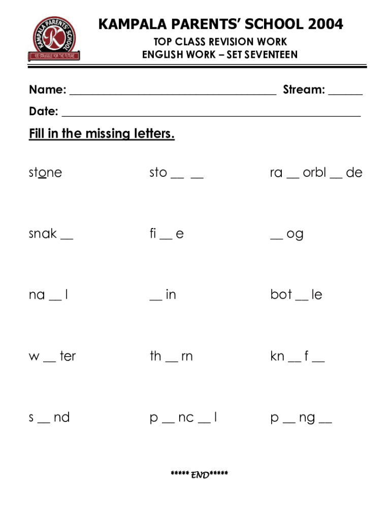 Kampala Parents' School provides revision work for top class students covering English, Colouring, General Knowledge, Numbers, and Reading.