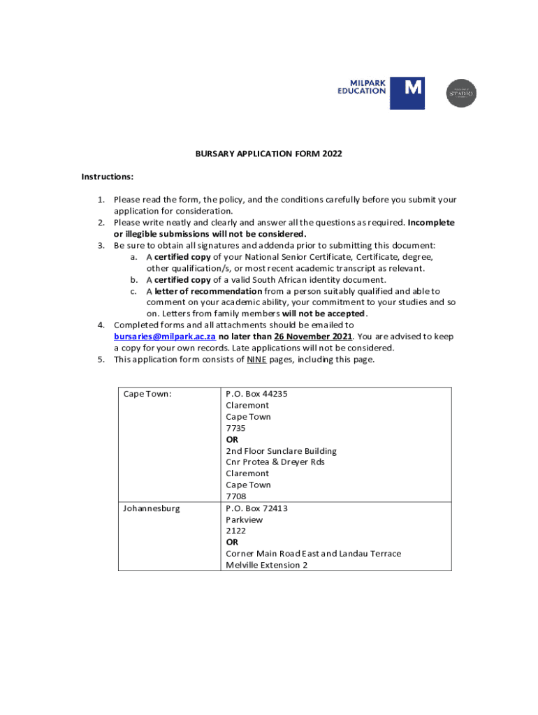 Get the free BURSARY APPLICATION FORM 2022 Instructions: 1. Please read ...