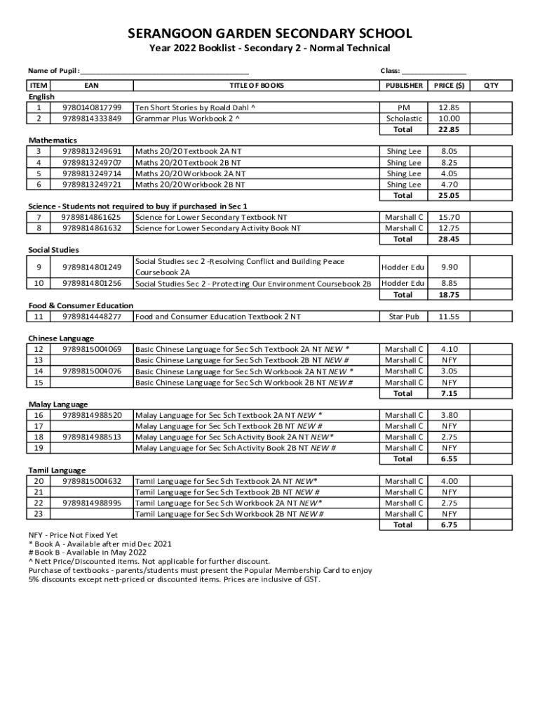 Year 2022 Book list Secondary 2 Normal TechnicalName of Pupil :___
