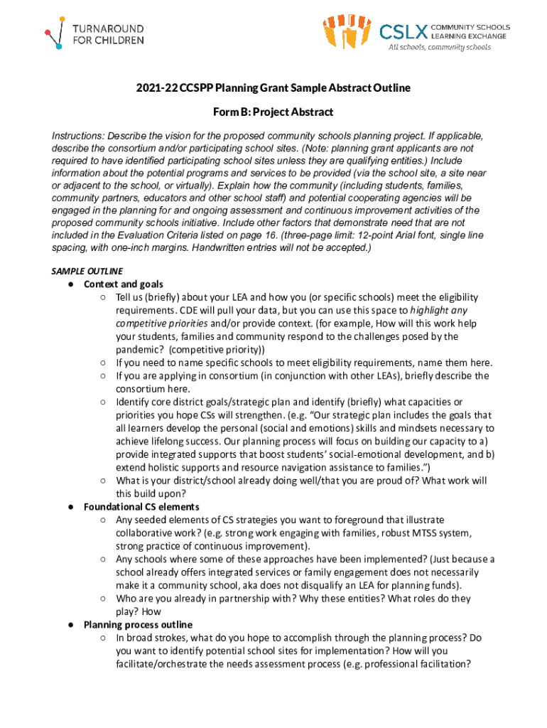 202122 CCSPP Planning Grant Sample Abstract Outline Form B: Project Abstract Instructions: Describe the vision for the proposed community schools planning project. If applicable, describe the consortium