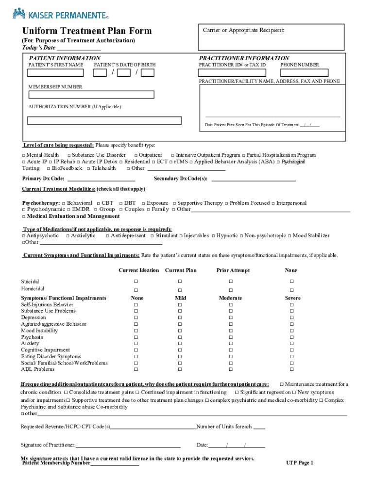 Uniform Treatment Plan Form Carrier or Appropriate Recipient:(For Purposes of Treatment Authorization) Today's Date PATIENT INFORMATIONPATIENTS FIRST NAMEPRACTITIONER INFORMATIONPATIENTS DATE OF BIRTH/PRACTITIONER