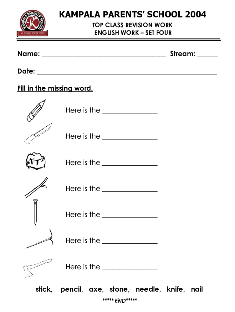 KAMPALA PARENTS SCHOOL 2004 TOP CLASS REVISION WORK ENGLISH WORK SET Surname: ___ Stream: ___ Date: ___ Fill in the missing word. Here is the ___ Here is the ___ Here is the ___ Here is the ___ Here