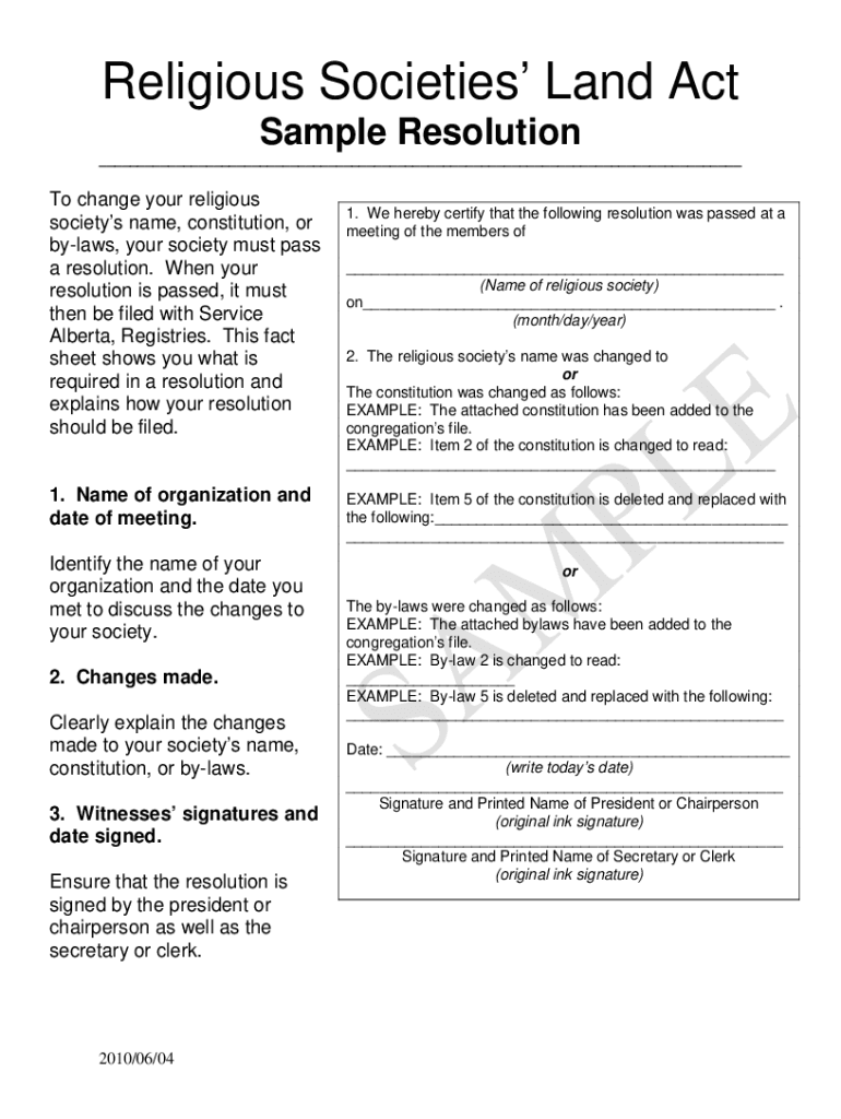 Religious Societies Land Act Sample Resolution ___To change your religious societies name, constitution, or bylaws, your society must pass a resolution. When your resolution is passed, it must then