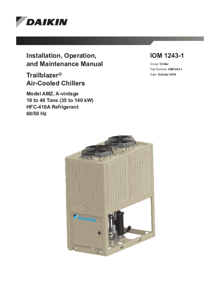 Installation, Operation, and Maintenance Manual Trailblazer Circuited Chillers Model AMZ, Vintage 10 to 40 Tons (35 to 140 kW) HFC410A Refrigerant 60/50 Hz IOM 12431 Group: Chiller Part Number: IOM12431