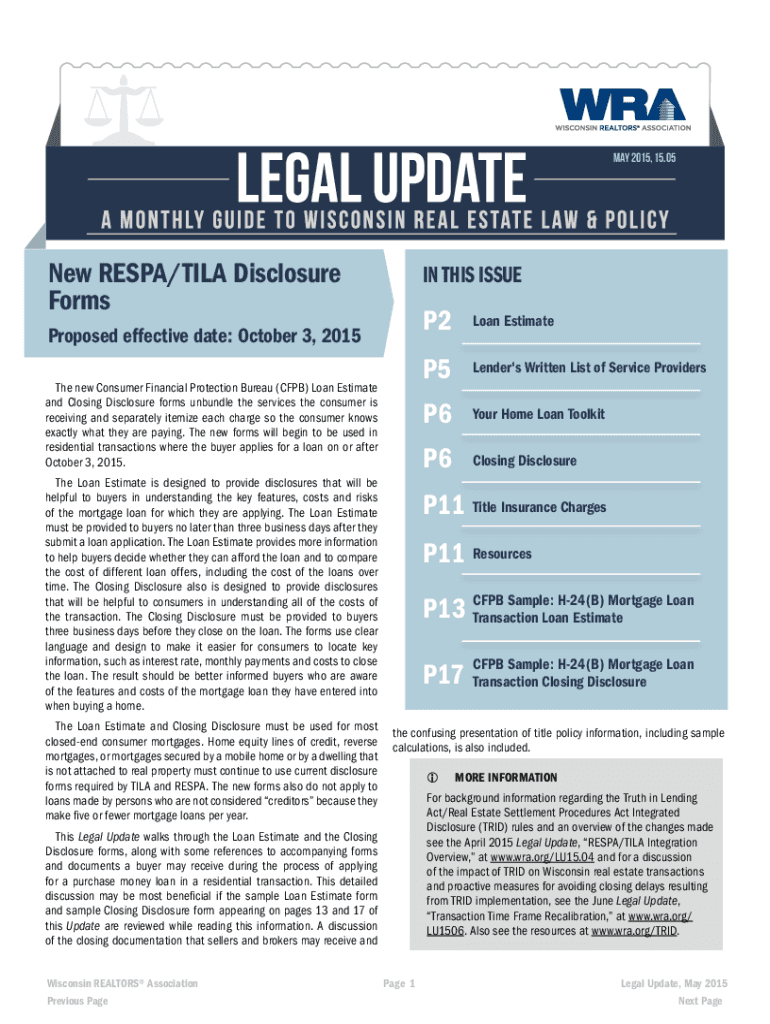 MAY 2015, 15.05New RESP/TILL Disclosure Forms Proposed effective date: October 3, 2015, The new Consumer Financial Protection Bureau (CFPB) Loan Estimate and Closing Disclosure forms unbundle the