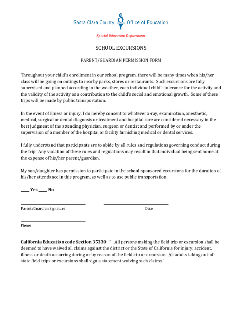 Special Education DepartmentSCHOOL EXCURSIONSPARENT/GUARDIAN PERMISSION FORMThroughout your children enrollment in our school program, there will be many times when his/her class will be going on
