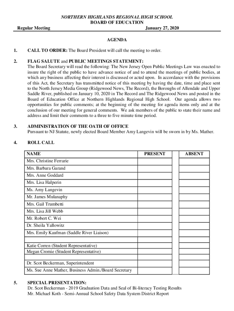 Regular MeetingNORTHERN HIGHLANDS REGIONAL HIGH SCHOOL BOARD OF EDUCATION January 27, 2020 AGENDA1.CALL TO ORDER: The Board President will call the meeting to order.2.FLAG SALUTE and PUBLIC MEETINGS