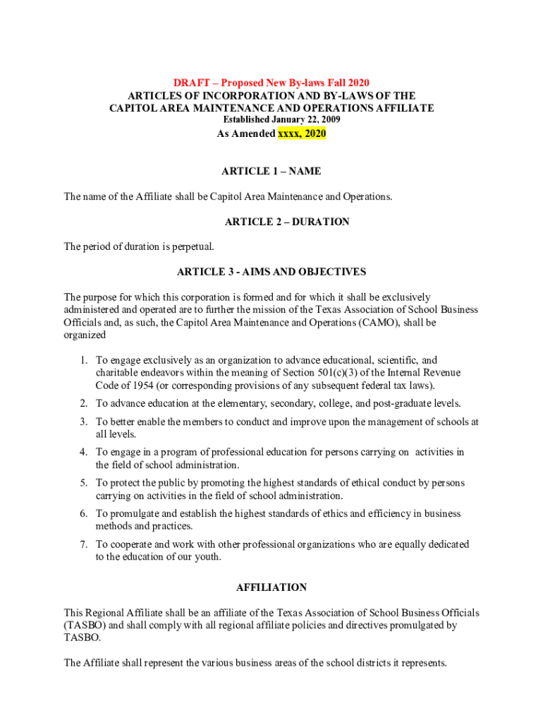 DRAFT Proposed New Bylaws Fall 2020 ARTICLES OF INCORPORATION AND BYLAWS OF THE CAPITOL AREA MAINTENANCE AND OPERATIONS AFFILIATE Established January 22, 2009As Amended XXX, 2020 ARTICLE 1 NAME The