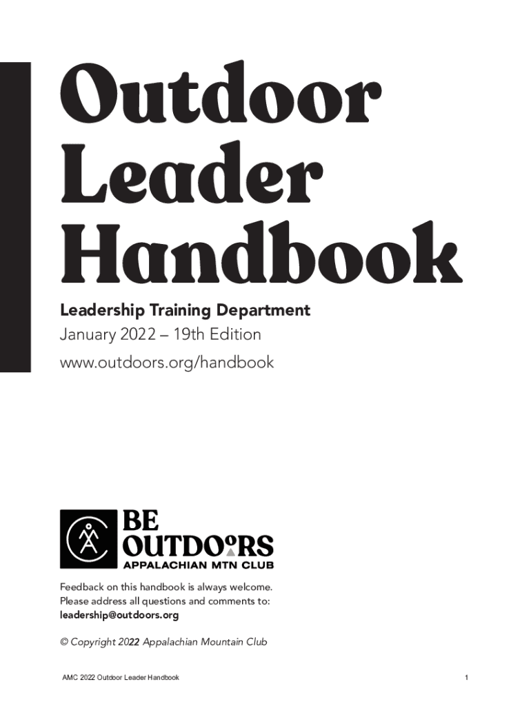 Outdoor Leader Handbook Leadership Training Department January 2022 19th Edition www.outdoors.org/handbookFeedback on this handbook is always welcome. Please address all questions and comments to: