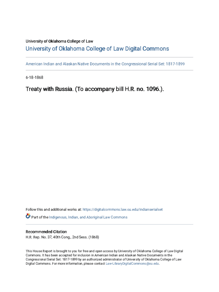 University of Oklahoma College of University of Oklahoma College of Law Digital Commons American Indian and Alaskan Native Documents in the Congressional Serial Set: 18171899 6181868Treaty with Russia.