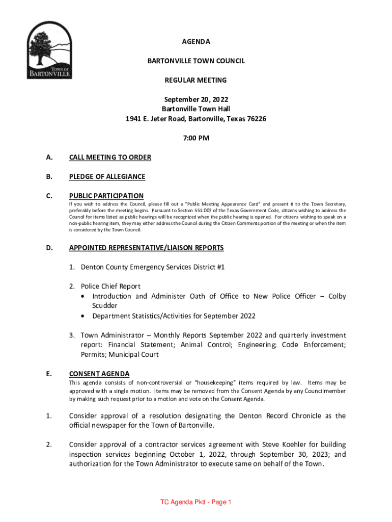 AGENDA BENTONVILLE TOWN COUNCIL REGULAR MEETING September 20, 2022, Bentonville Town Hall 1941 E. Peter Road, Bentonville, Texas 76226 7:00 PM A.CALL MEETING TO ORDER.PLEDGE OF ALLEGIANCE.PUBLIC PARTICIPATION