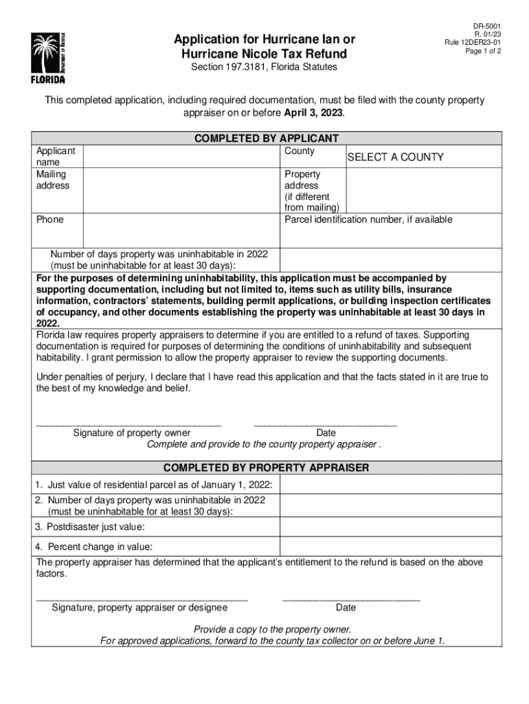Application for Hurricane Ian or Hurricane Nicole Tax RefundDR5001 R. 01/23 Rule 12DER2301 Page 1 of 2Section 197.3181, Florida StatutesThis completed application, including required documentation,