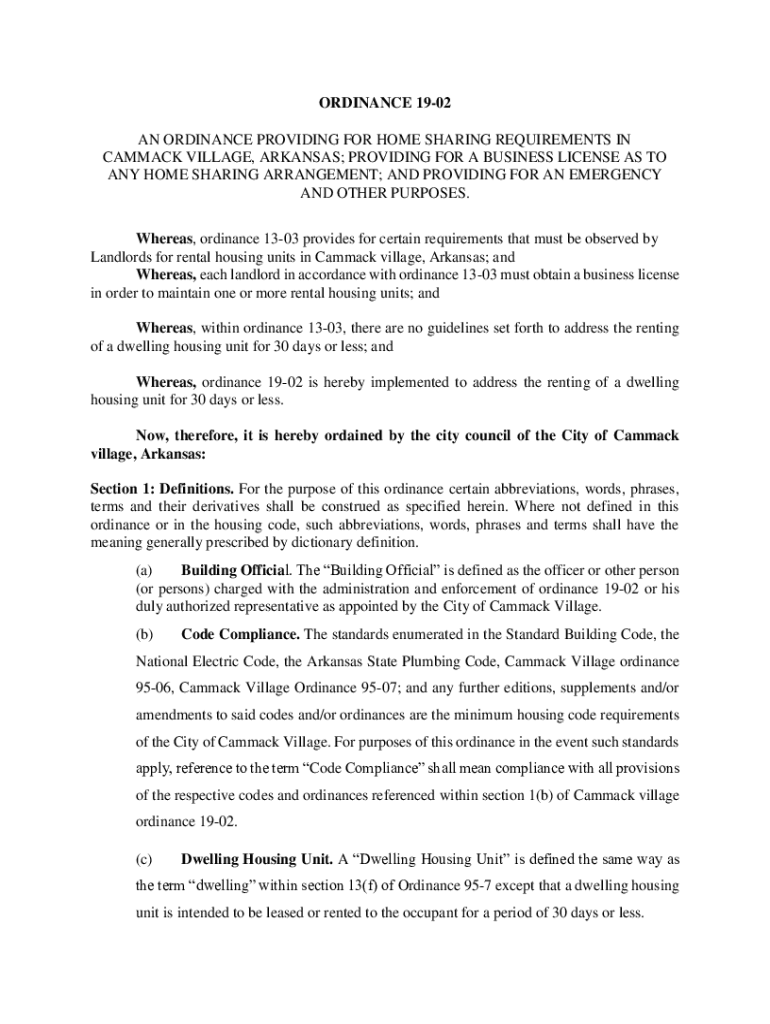 ORDINANCE 1902 AN ORDINANCE PROVIDING FOR HOME SHARING REQUIREMENTS IN CARMACK VILLAGE, ARKANSAS; PROVIDING FOR A BUSINESS LICENSE AS TO ANY HOME SHARING ARRANGEMENT; AND PROVIDING FOR AN EMERGENCY