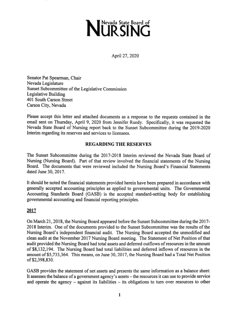 I Nevada State Board nursing April 27, 2020Senator Pat Spearman, Chair Nevada Legislature Sunset Subcommittee of the Legislative Commission Legislative Building 401 South Carson Street Carson City,