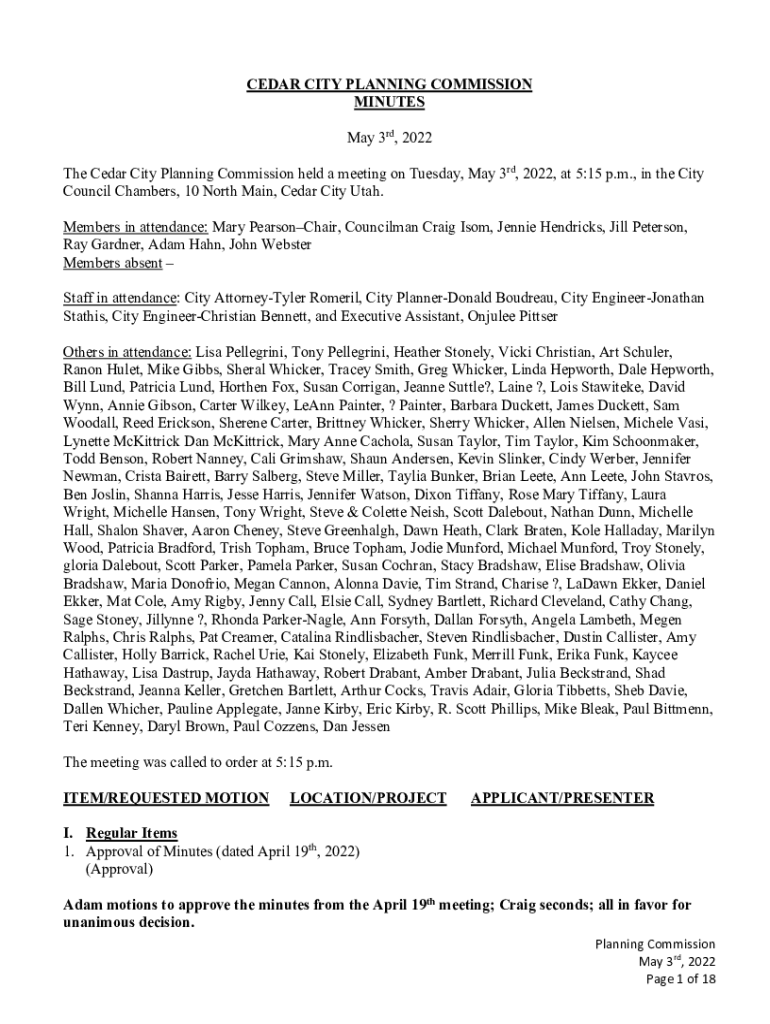 The Cedar City Planning Commission held a meeting on Tuesday, May 3rd, 2022, at 5:15 p.m., in the City