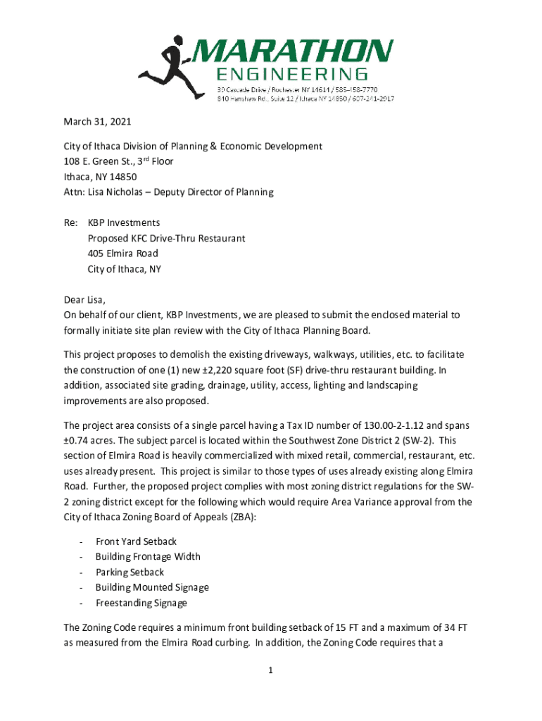 March31,2021 CityofIthacaDivisionofPlanning&EconomicDevelopment 108E. Greens.,3rdFloor Ithaca,NY14850 Attn:LisaNicholasDeputyDirectorofPlanning Re: Investments ProposedKFCDriveThruRestaurant 405ElmiraRoad