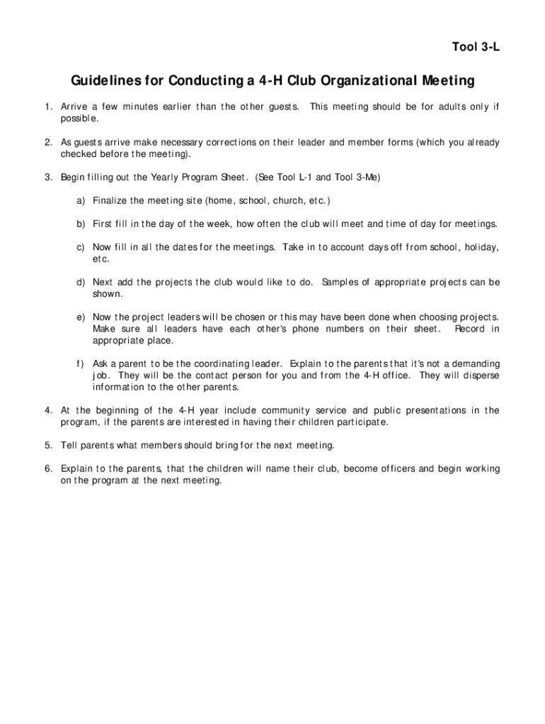 Tool 3LGuidelines for Conducting a 4H Club Organizational Meeting 1. Arrive a few minutes earlier than the other guests. This meeting should be for adults only if possible. 2. As guests arrive make