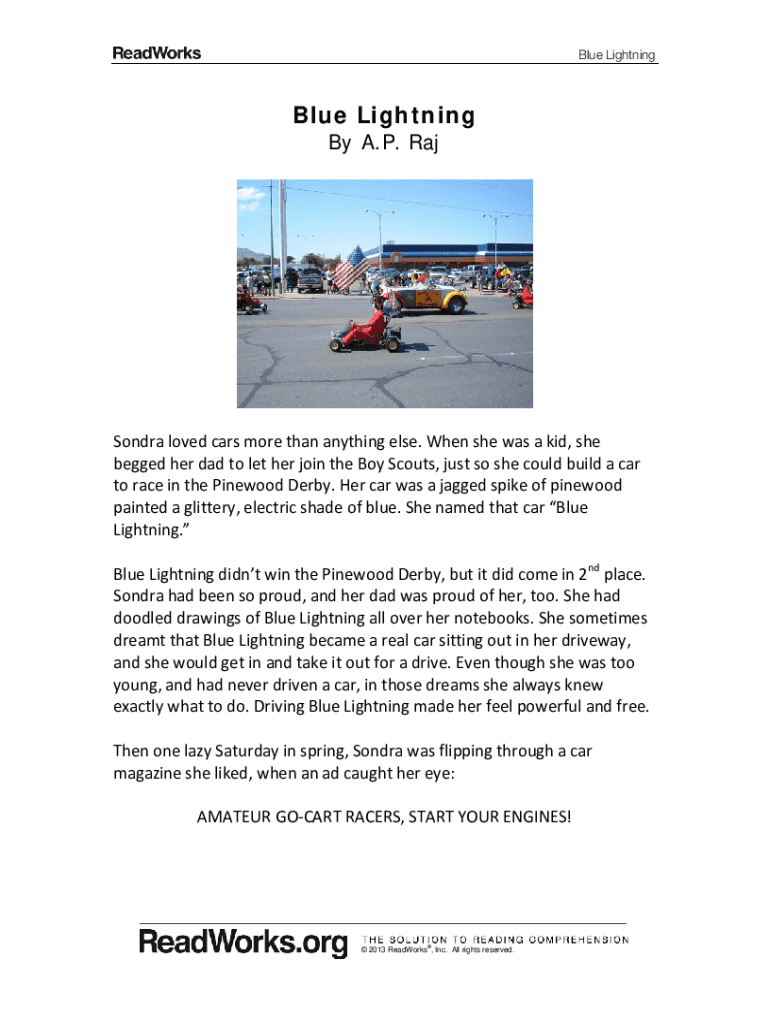 Blue LightningBlue Lightning By A.P. Rajendra loved cars more than anything else. When she was a kid, she begged her dad to let her join the Boy Scouts, just so she could build a car to race in the