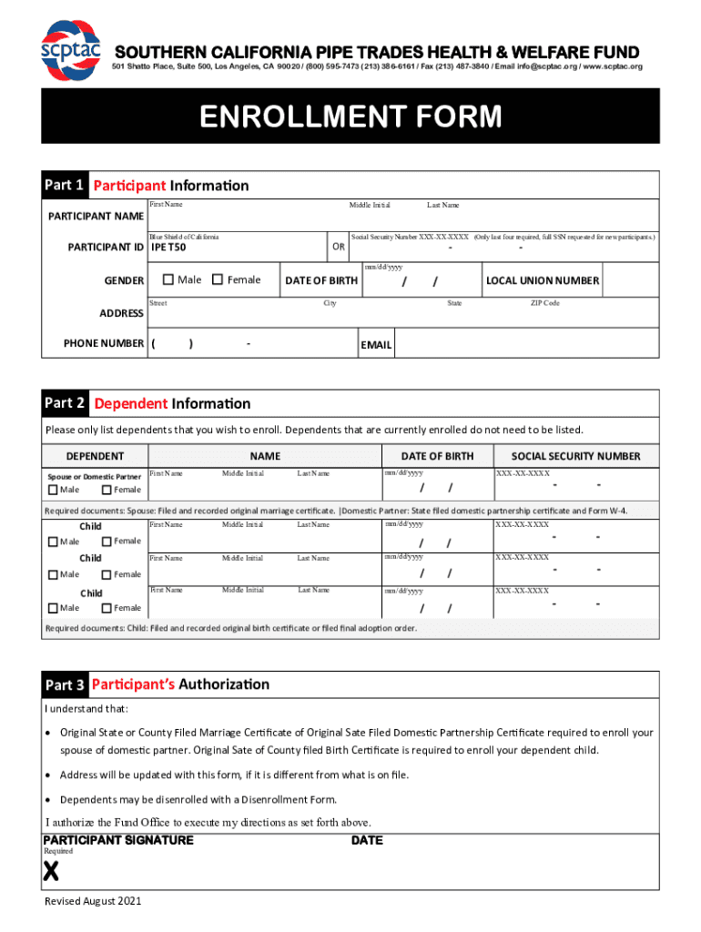 SOUTHERN CALIFORNIA PIPE TRADES HEALTH & WELFARE FUND501 Shaft Place, Suite 500, Los Angeles, CA 90020 / (800) 5957473 (213) 3866161 / Fax (213) 4873840 / Email info@scptac.org / www.scptac.orgENROLLMENT