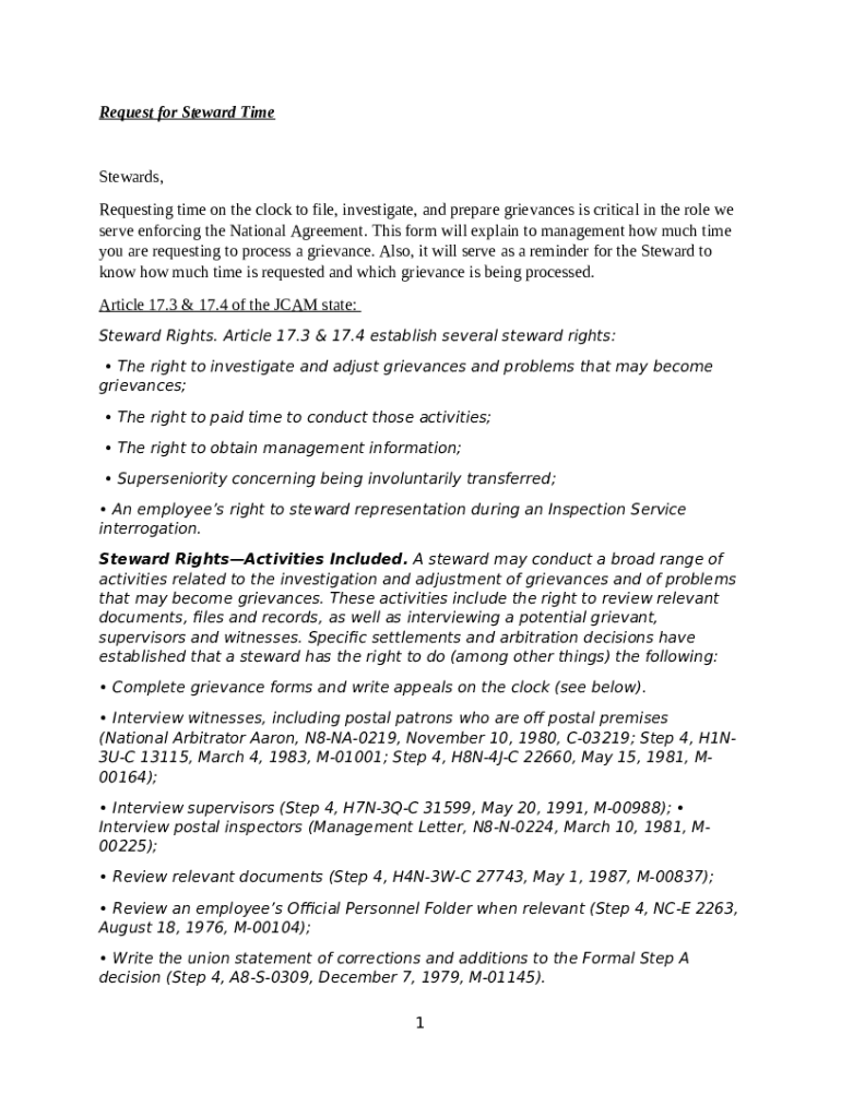 The Request for Steward Time Explanatio... is a fillable form in MS Word extension required to be submitted to the relevant address in order to provide specific info. It must be completed and signed, which is possible manually, or with the help of a particular software e. g. PDFfiller. It helps to fill out any PDF or Word document right in the web, customize it according to your requirements and put a legally-binding e-signature. Right away after completion, you can send the Request for Steward Time Explanatio... to the relevant recipient, or multiple ones via email or fax. The blank is printable as well because of PDFfiller feature and options presented for printing out adjustment. Both in electronic and in hard copy, your form should have a neat and professional appearance. You may also turn it into a template for further use, so you don't need to create a new file again. You need just to edit the ready sample.