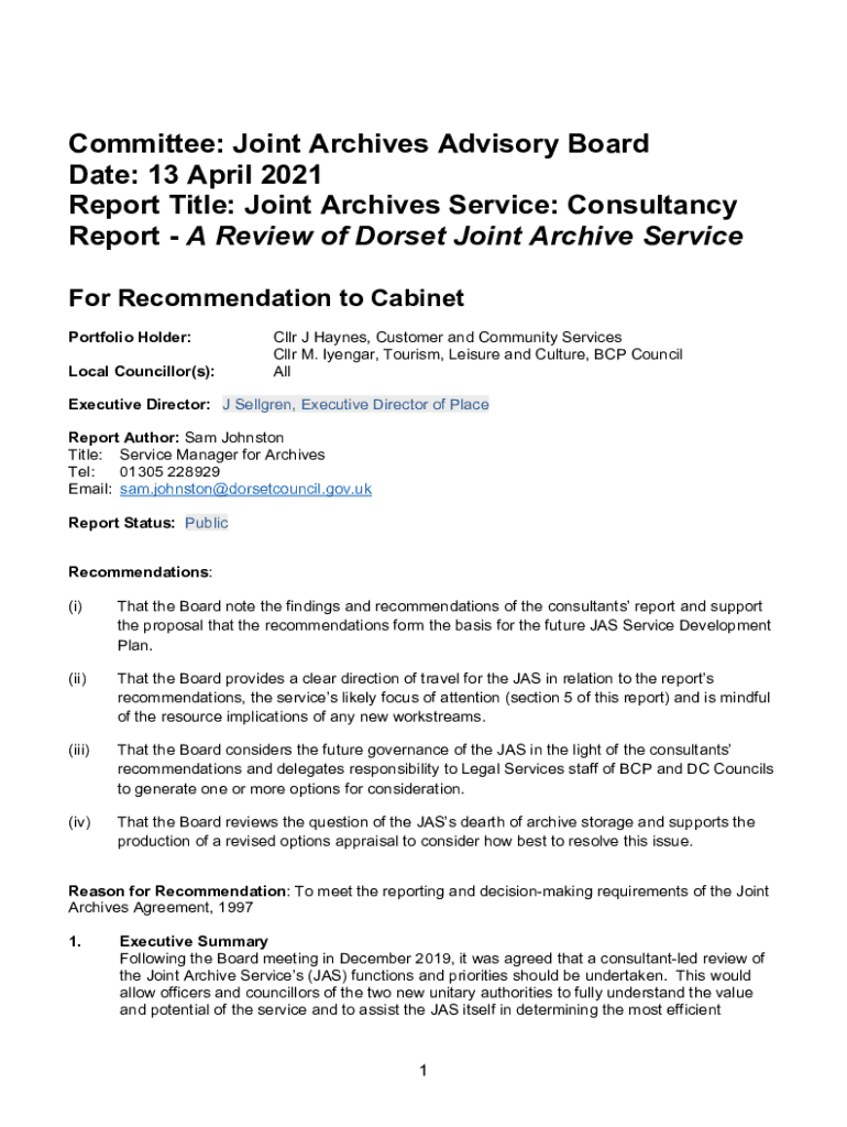 Committee: Joint Archives Advisory Board Date: 13 April 2021 Report Title: Joint Archives Service: Consultancy Report A Review of Dorset Joint Archive Service For Recommendation to Cabinet Portfolio