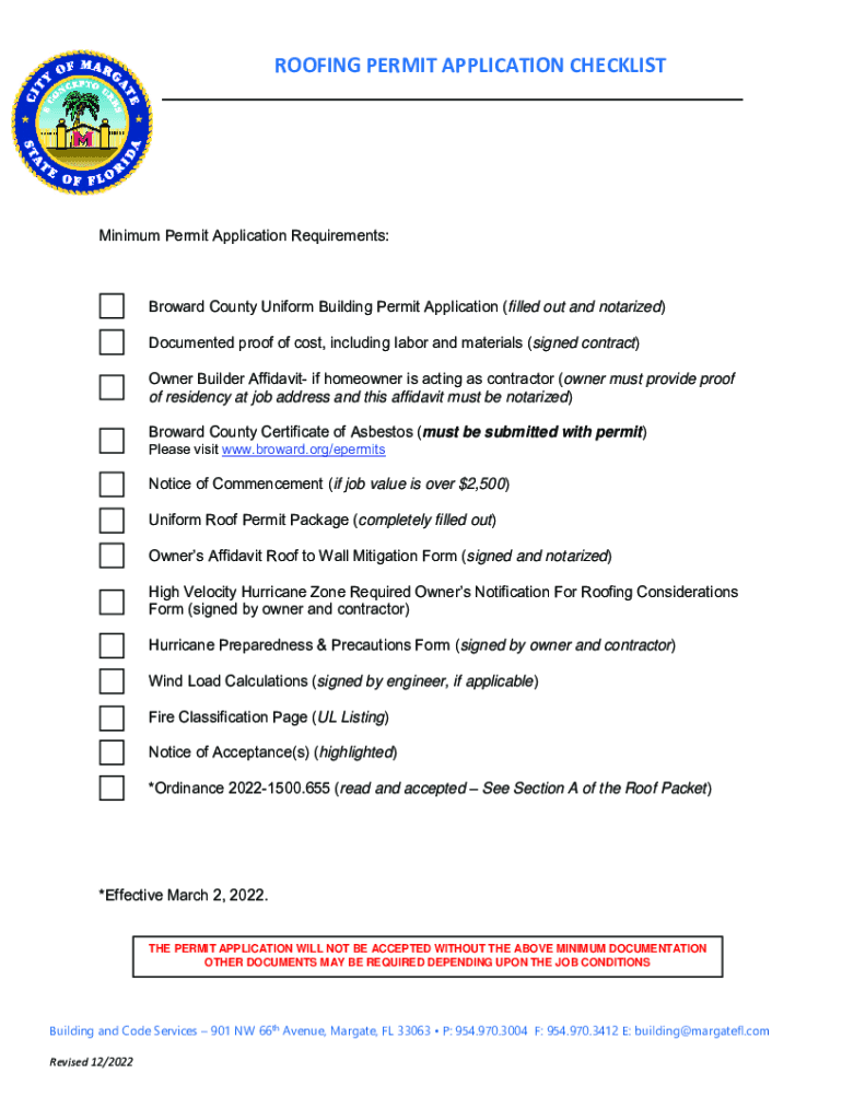 ROOFING PERMIT APPLICATION CHECKLIST I TY MARGATE Together We Make It GreatMinimum Permit Application Requirements:Broward County Uniform Building Permit Application (filled out and notarized) Documented