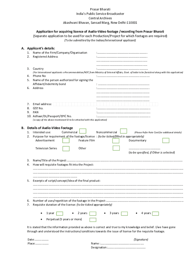 Prasad Bharat India's Public Service Broadcaster Central Archives Aashni Haven, San sad Mary, New Delhi110001 Application for acquiring license of AudioVideo footage /recording from Prasad Bharat