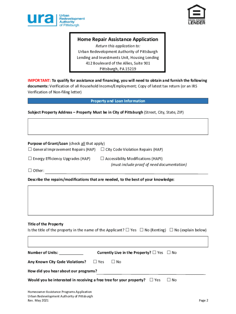URA Housing Lending & Investments 2022 Home Repair Assistance Application The Urban Redevelopment Authority of Pittsburgh (URA) offers a variety of programs to help homeowners and renters make necessary