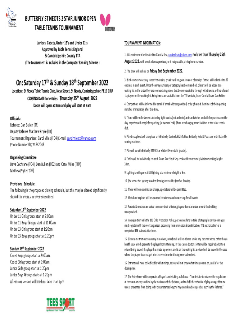 Get the free BUTTERFLY ST NEOTS 2 STAR JUNIOR OPEN