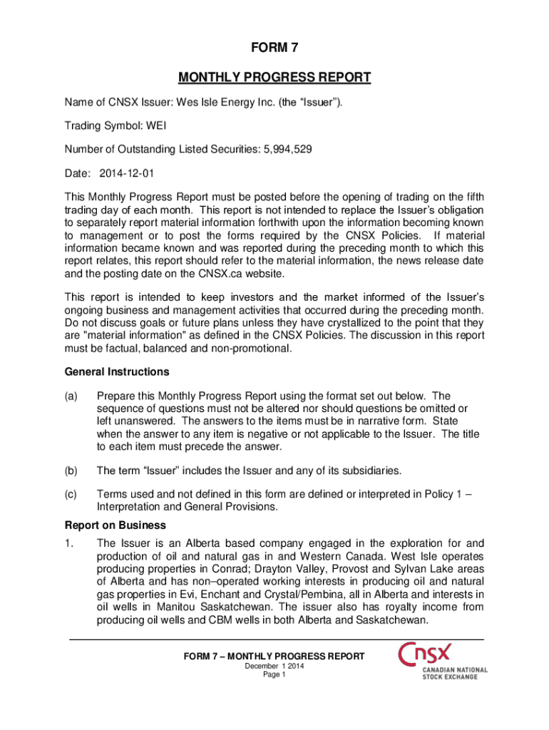 FORM 7 MONTHLY PROGRESS REPORT Name of CNS Issuer: Was Isle Energy Inc. (the Issuer). Trading Symbol: WEI Number of Outstanding Listed Securities: 5,994,529 Date: 20141201 This Monthly Progress Report