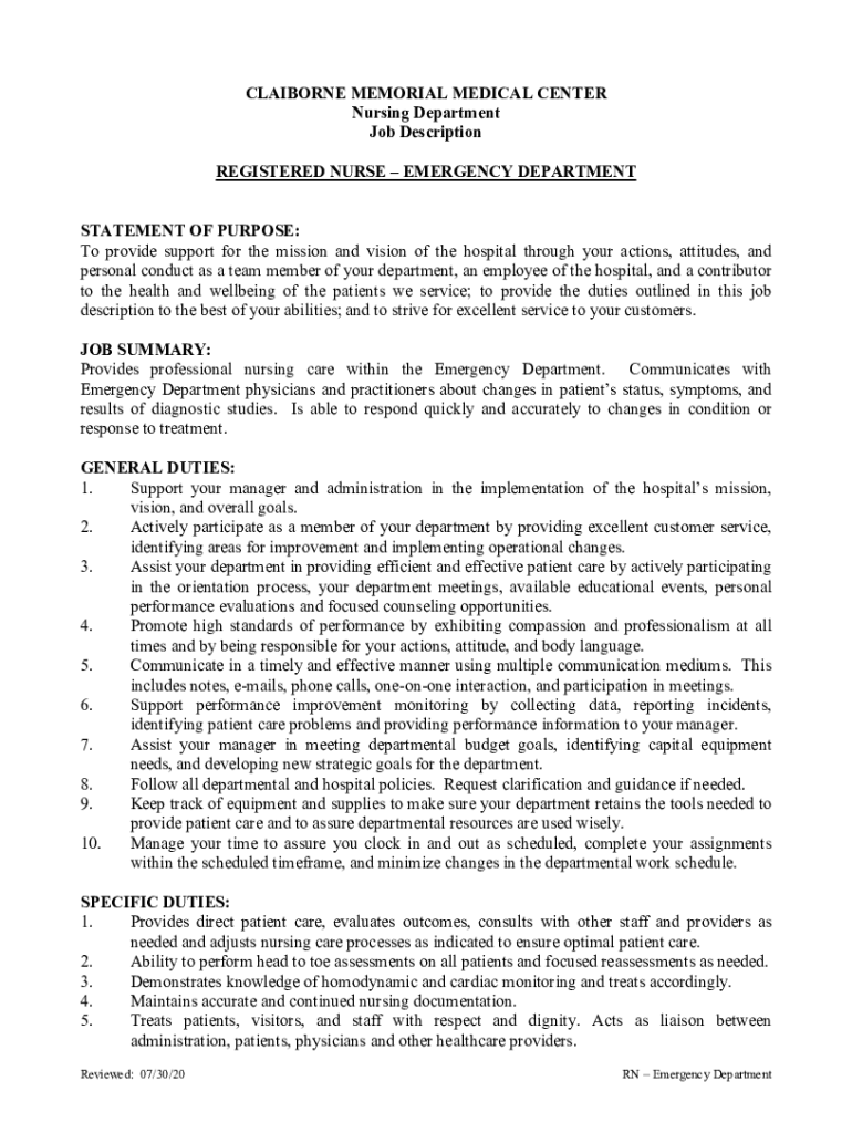 CLAIBORNE MEMORIAL MEDICAL CENTER Nursing Department Job Description REGISTERED NURSE EMERGENCY DEPARTMENT STATEMENT OF PURPOSE: To provide support for the mission and vision of the hospital through
