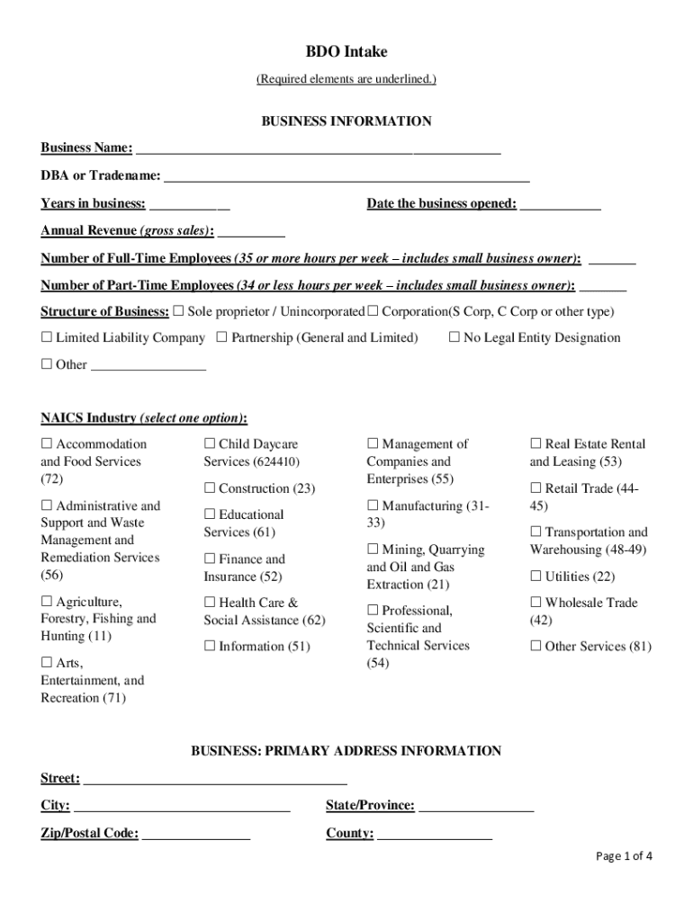 BDO Intake (Required elements are underlined.)BUSINESS INFORMATION Business Name: ___ DBA or Trade name: ___ Years in business: ___Date the business opened: ___Annual Revenue (gross sales): ___ Number
