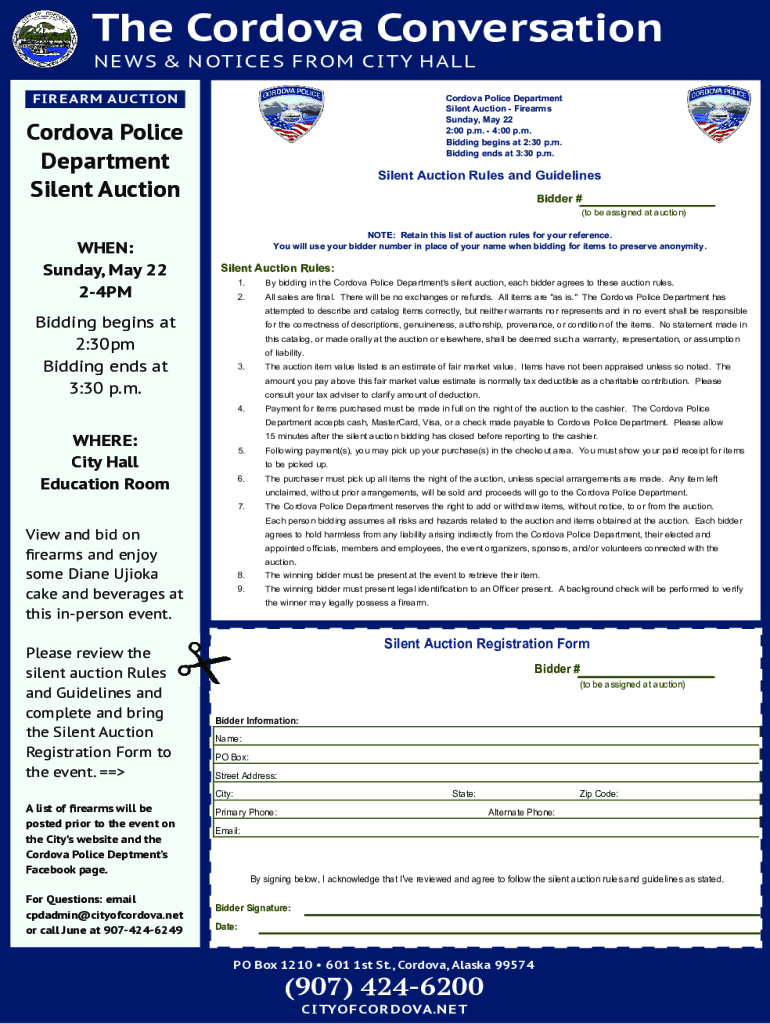 The Cordova Conversations & NOTICES FROM CITY HALL FIREARM AUCTIONCordova Police Department Silent Auction Firearms Sunday, May 22 2:00 p.m. 4:00 p.m. Bidding begins at 2:30 p.m. Bidding ends at 3:30